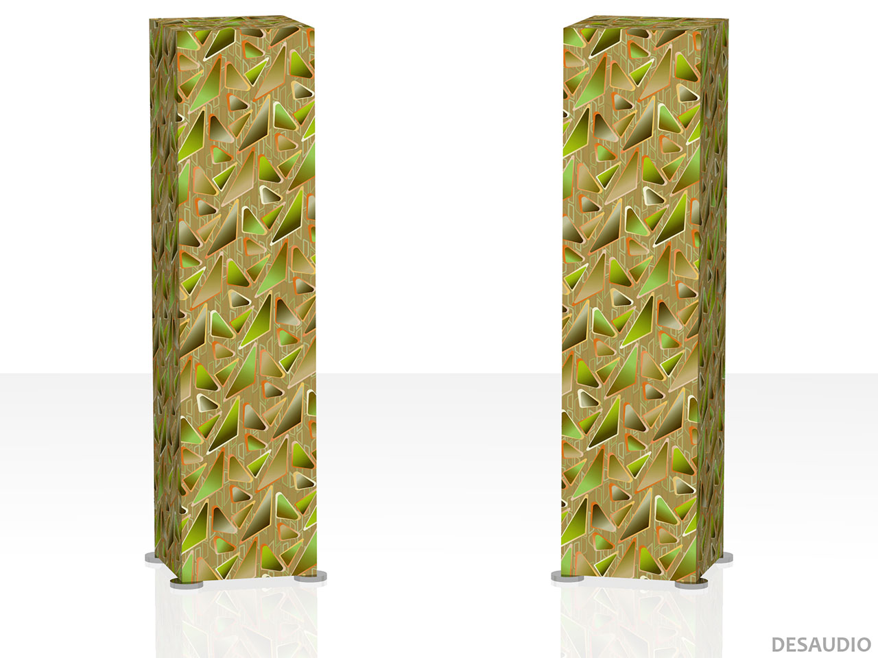 This is a promotional mockup on the computer rendered 3D model of a floorstanding tower speaker, with the design placed on two sides and top. The other sides (back and other side) have info about the design.