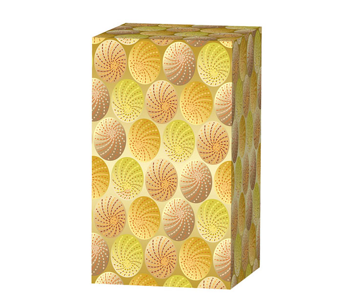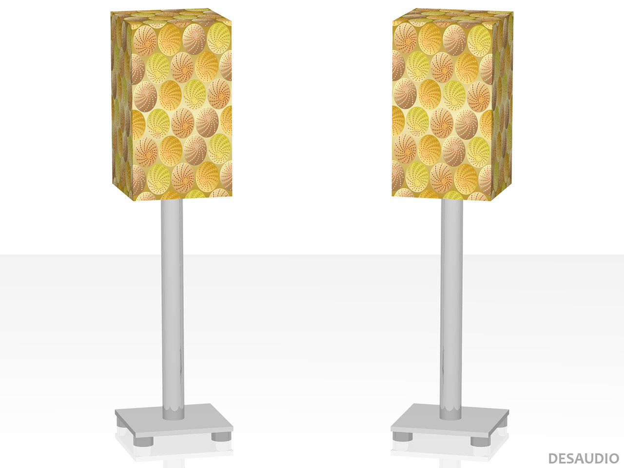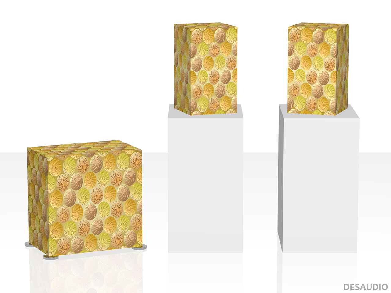 All patterns can be scaled seamlessly to any size, as desired, when the print file is prepared for printing, cutting and sewing, for the intended loudspeaker(s). The ambiance of a pattern is quite different based on the scale, as the 3D rendering below shows. A small scaling is modest in feel, a middle scaling is distinctive, while a large scaling is decidedly bold and daring.