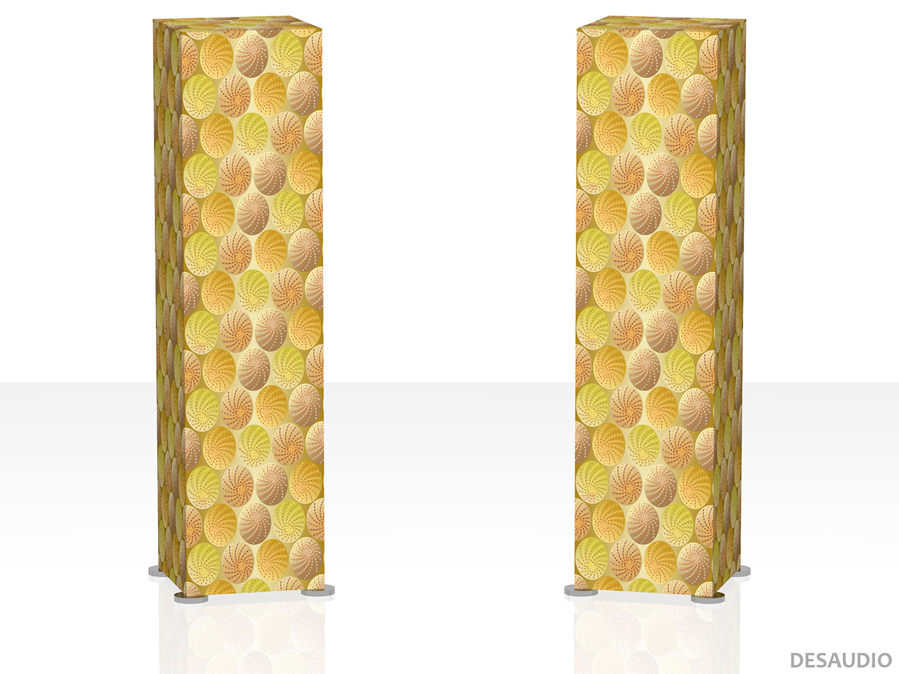 This is a promotional mockup on the computer rendered 3D model of a floorstanding tower speaker, with the design placed on two sides and top. The other sides (back and other side) have info about the design.