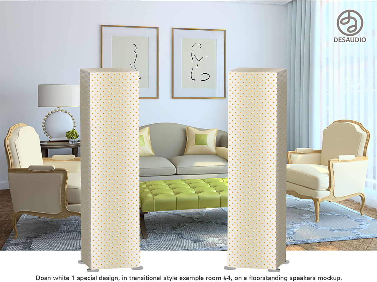 All patterns can be scaled seamlessly to any size, as desired, when the print file is prepared for printing, cutting and sewing, for the intended loudspeaker(s). The ambiance of a pattern is quite different based on the scale, as the 3D rendering below shows. A small scaling is modest in feel, a middle scaling is distinctive, while a large scaling is decidedly bold and daring.