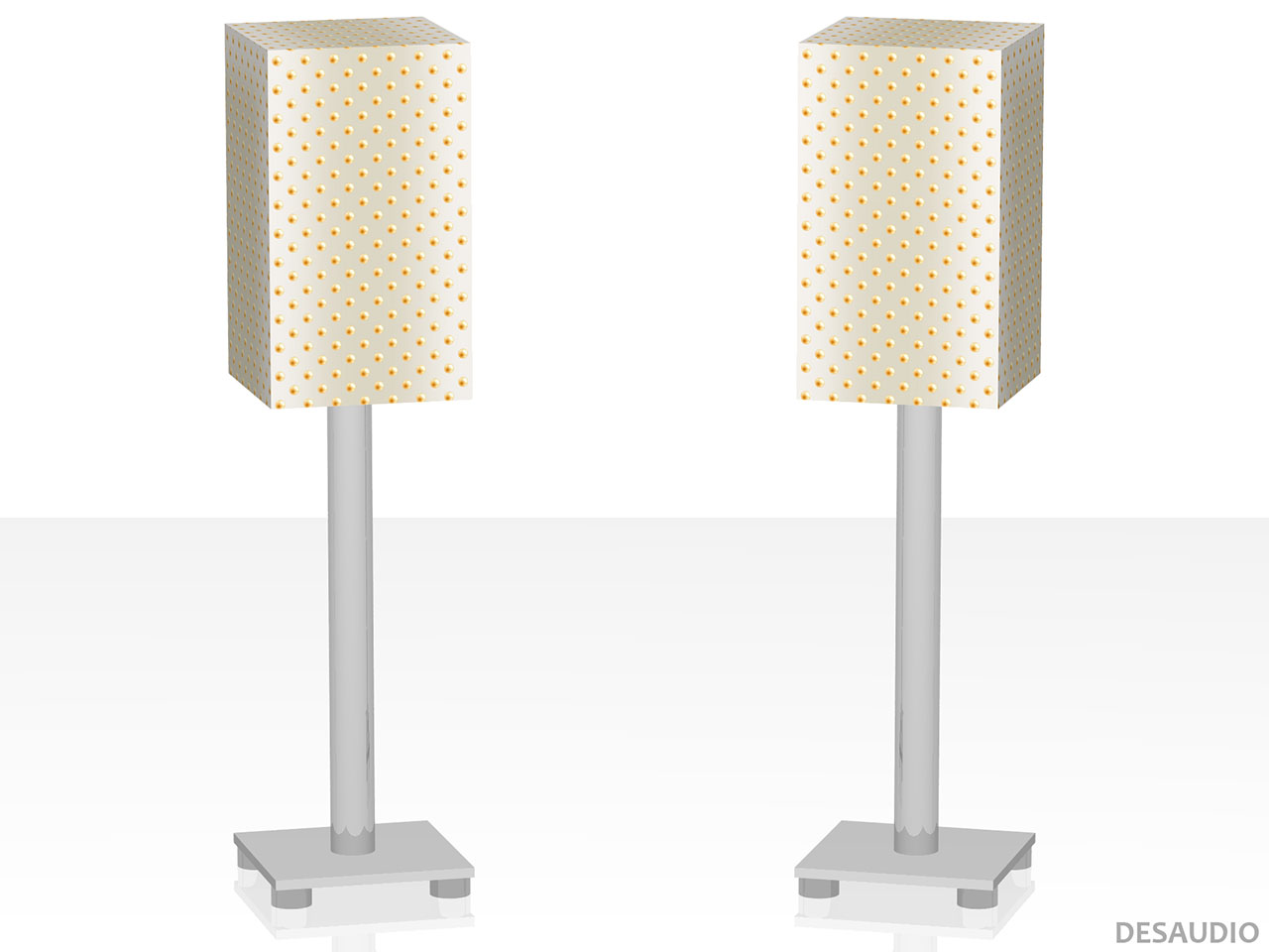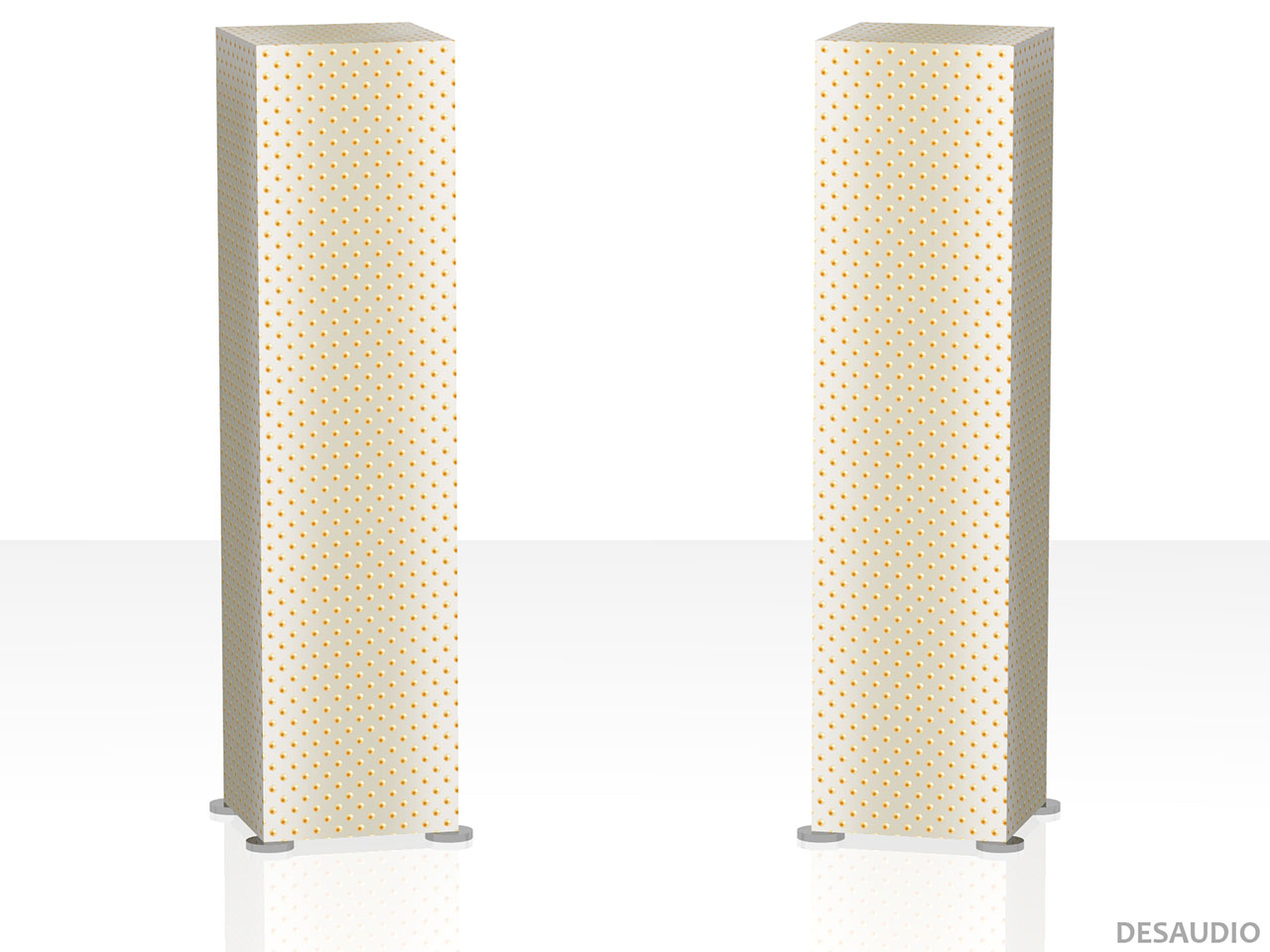This is a promotional mockup on the computer rendered 3D model of a floorstanding tower speaker, with the design placed on two sides and top. The other sides (back and other side) have info about the design.