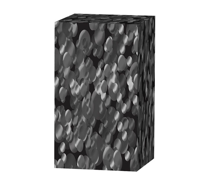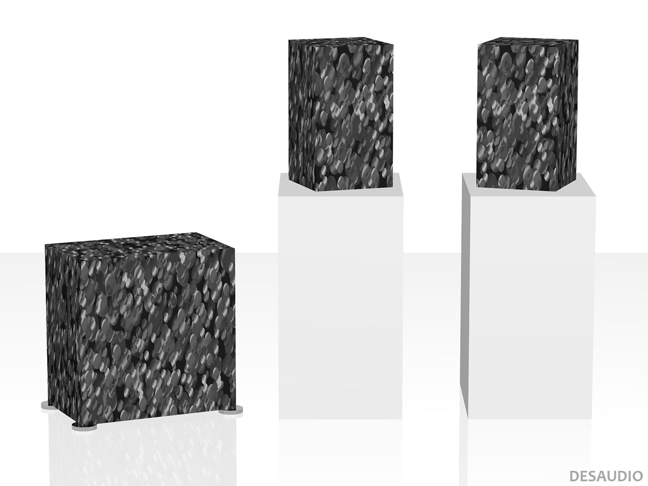 The random grey tones of the dots on top of the black background of the Yvor black 1 design are like shiny specks of obsidian, creating a novel look among the conventional black coloring of many contemporary loudspeaker looks.