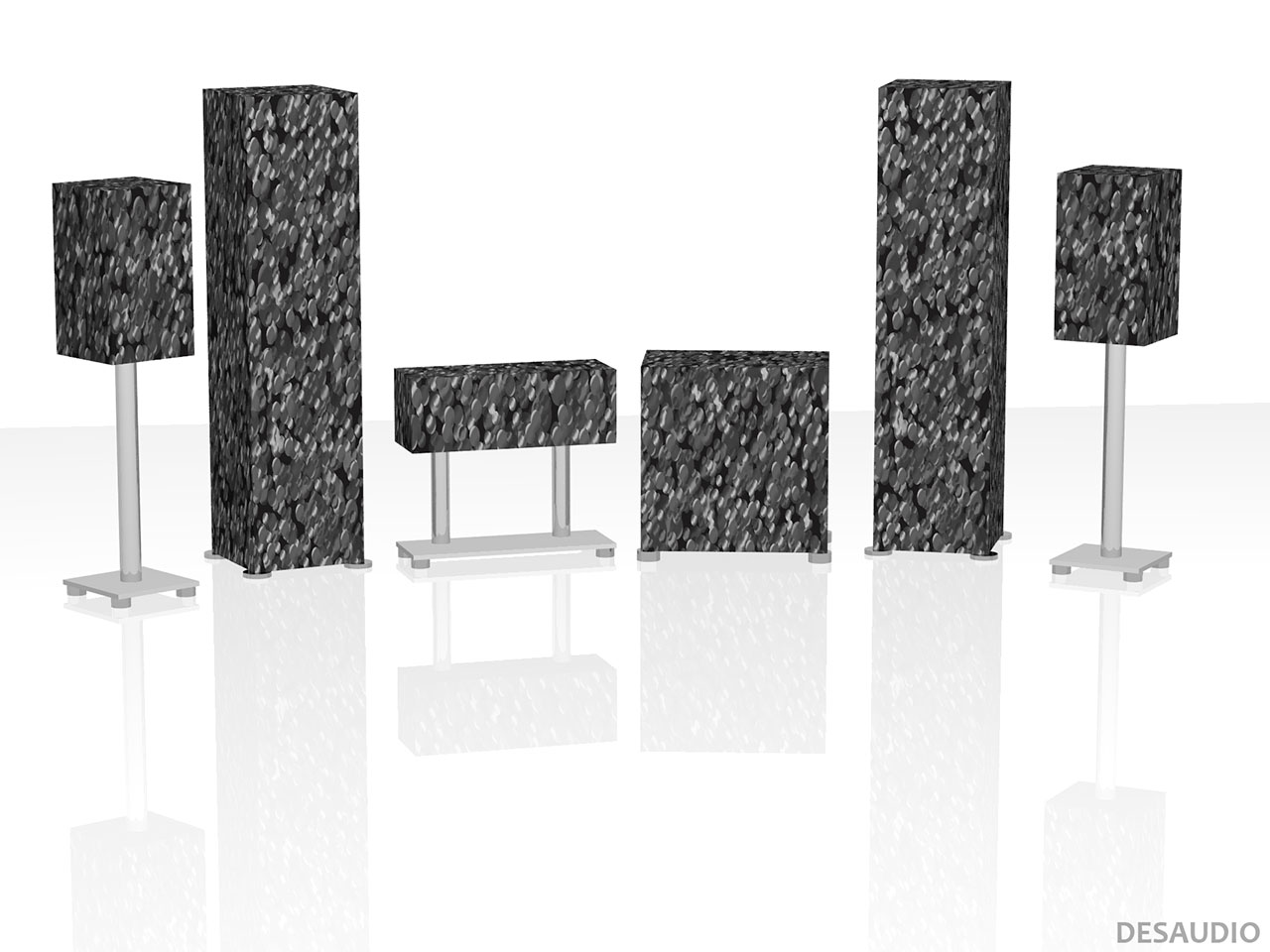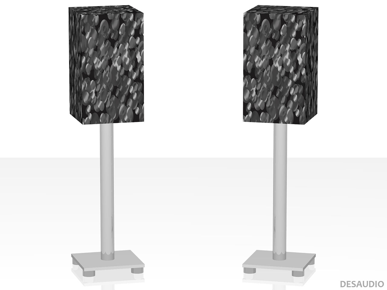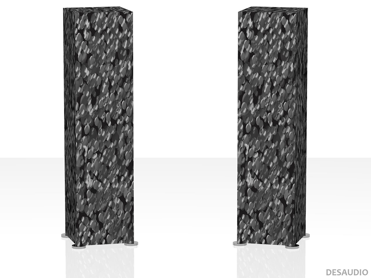 This is a promotional mockup on the computer rendered 3D model of a floorstanding tower speaker, with the design placed on two sides and top. The other sides (back and other side) have info about the design.