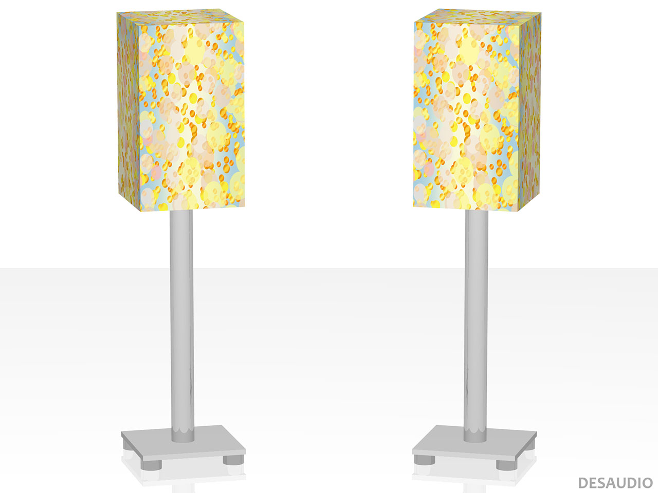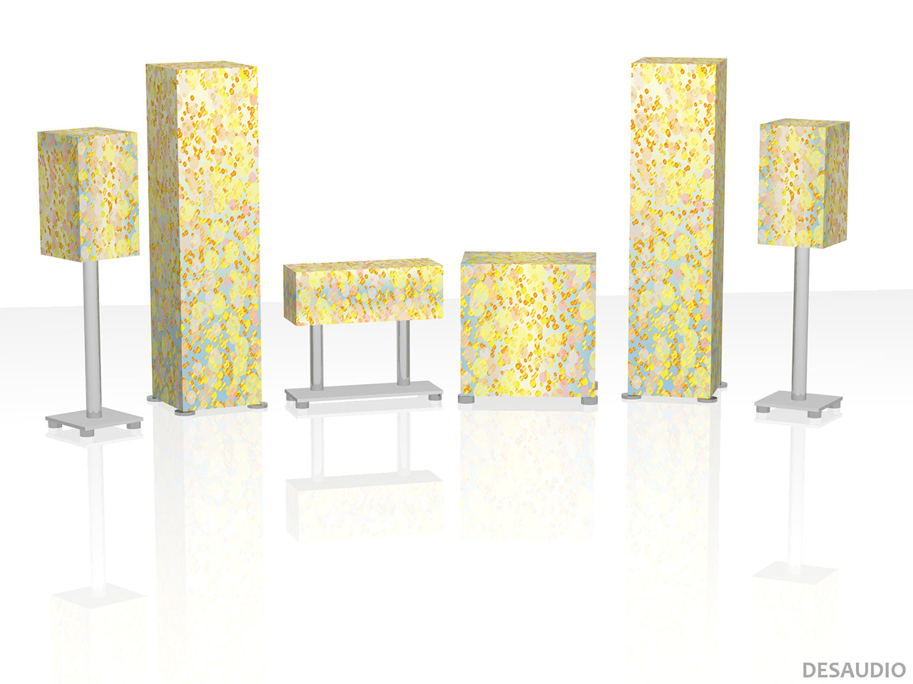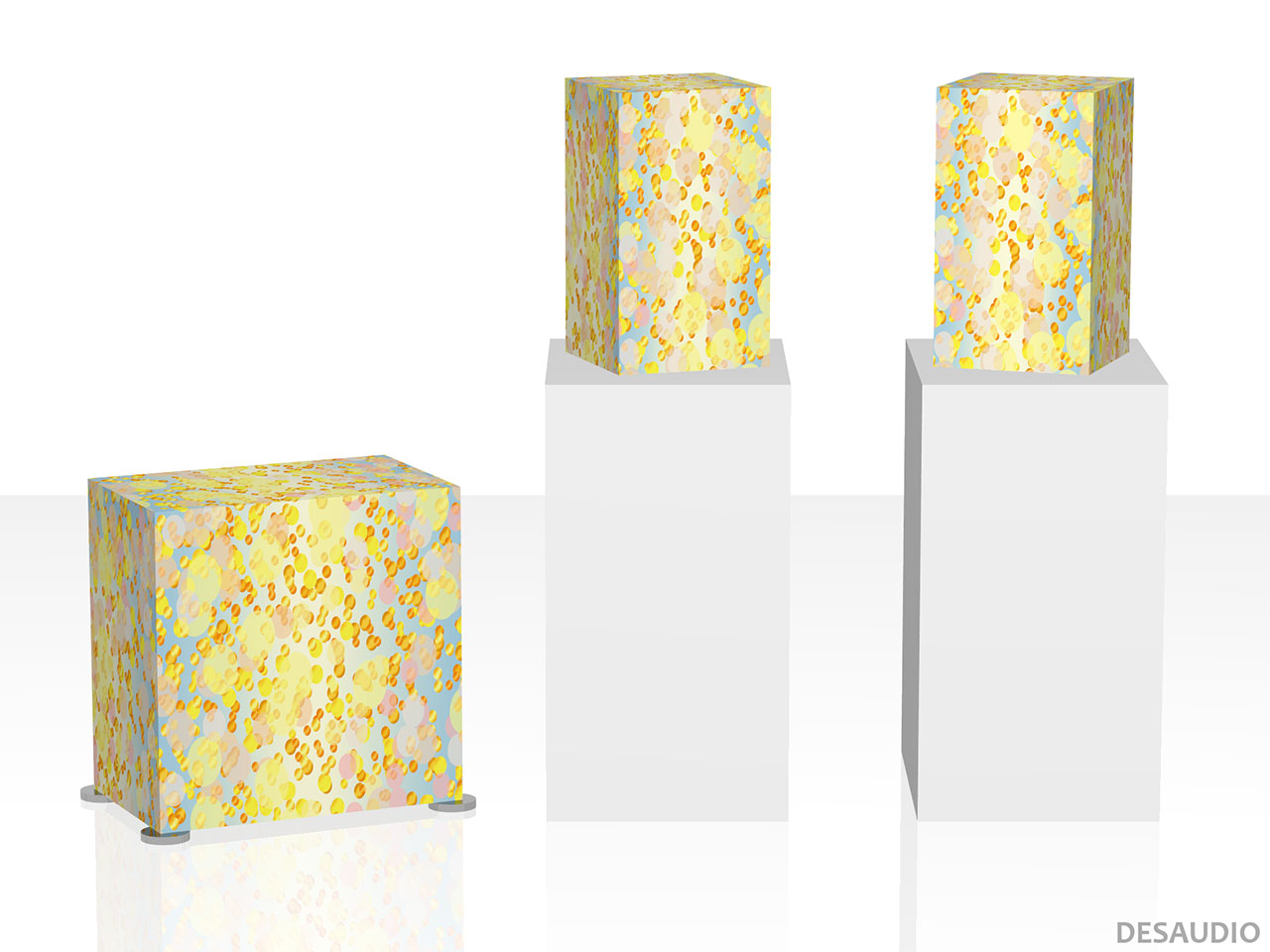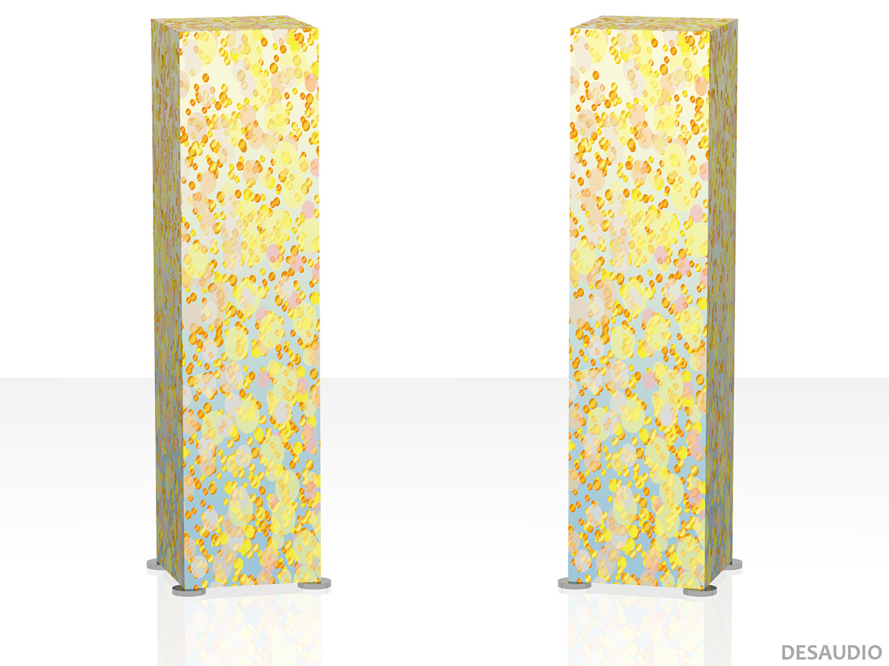 This is a promotional mockup on the computer rendered 3D model of a floorstanding tower speaker, with the design placed on two sides and top. The other sides (back and other side) have info about the design.